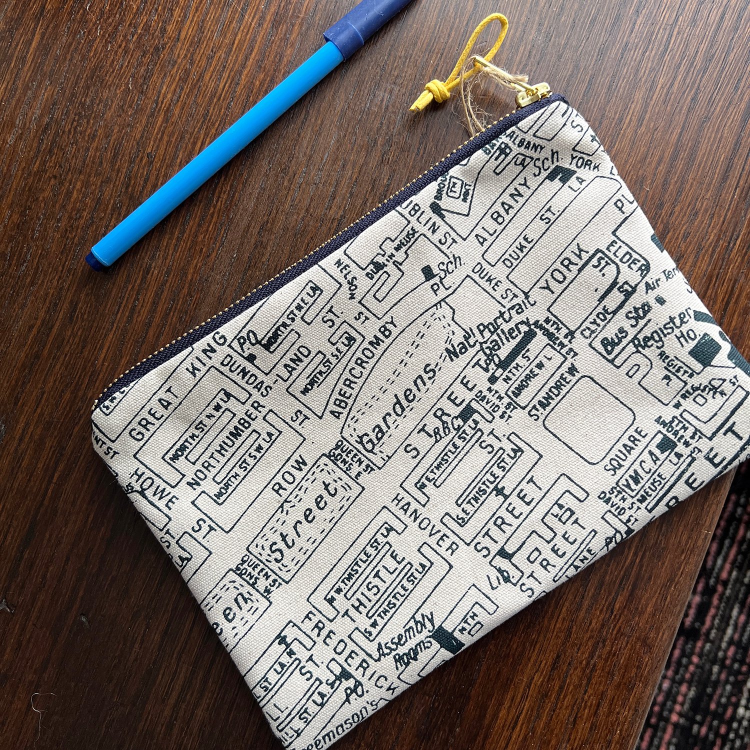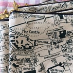 A large clutch purse screenprinted with details of a vintage Edinburgh street map.