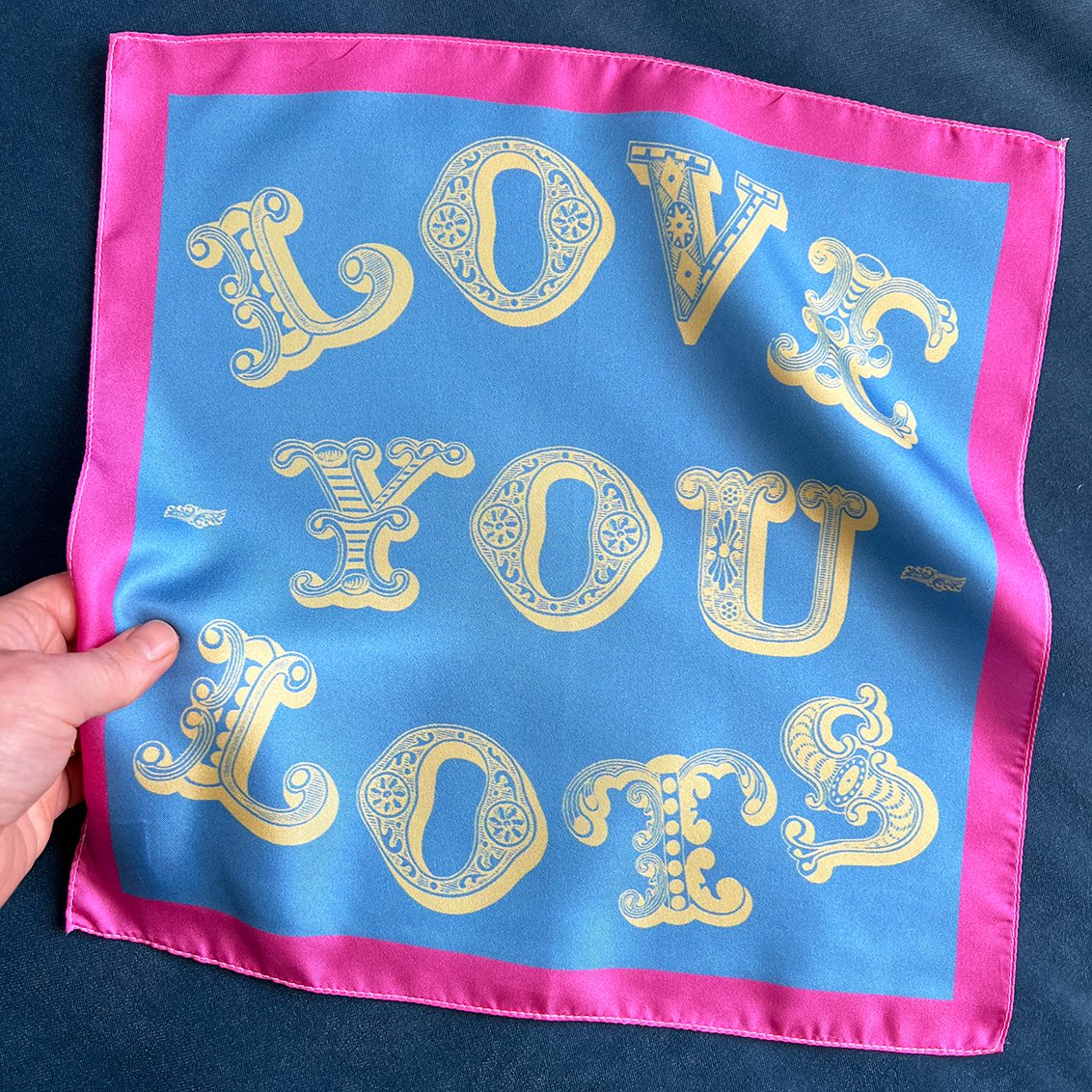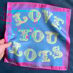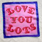 An individual 100% silk square printed with the words, Love You Lots.